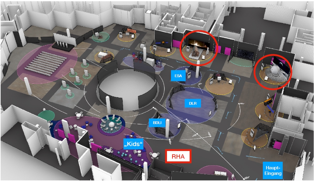 Lageplan mit Ständen der ArianeGroup (ARIANE Raketen), von AIRBUS Defence and Space (Astronautische Raumfahrt, ESM ORION), und dem Verein Raumfahrthistorisches Archiv Bremen e.V. (kurz: RHA) (Firmen-Geschichte / eigene Bücher).